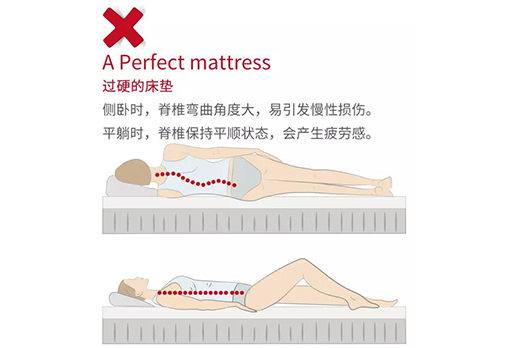 同理,偏硬型床垫同样对脊椎健康影响较大。由于人的臀部和背部要厚一些,床垫如果没有一点弹性,或者弹性不够,人在平卧和侧卧的时候,腰部就一直是悬空的,导致其在睡眠的整个过程中处于一种紧张的状态,因而也就得不到充分的休息,极易引发脊椎的病变。