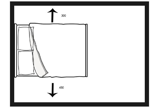 如果床需要留侧面宽,小户型留300mm-450mm的大小比较适宜,因为床上方空间比较大,侧面宽稍窄一点也没问题。如果一家人体型高大,可以再拓宽一些,保证自己可以行动自如是最好的。